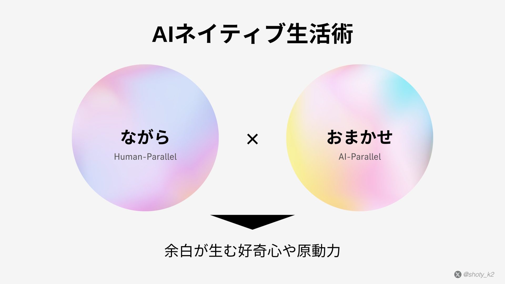 しかし、AIネイティブな生き方は、人が休息や趣味を楽しんでいる間すらもAIが着実に成果を出すこと、そしてそれによって余白を生み、好奇心を持ち続けることを目指しています。 第2回で紹介した「ながら作業(Human-Parallel)」と合わせれば、1日24時間を擬似的に拡張できます。