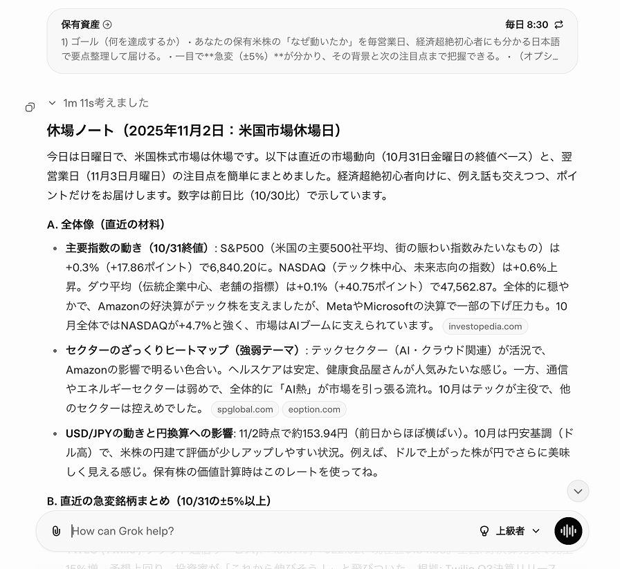 AI関連企業の個別株を複数購入しており、かつ場合によってはX(旧Twitter)で多くの最新ニュースが公開されることもあるため、X上の情報も合わせて取得できるGrokを活用しています。