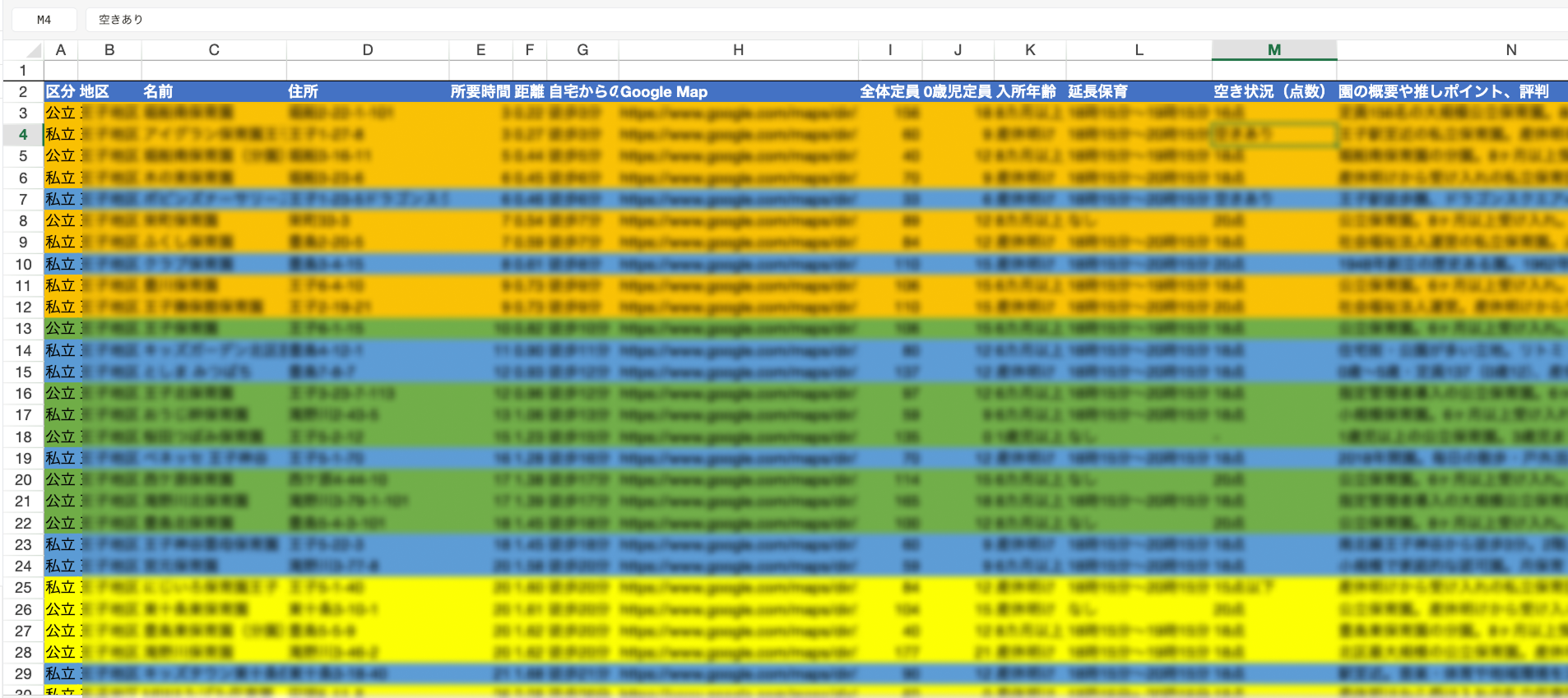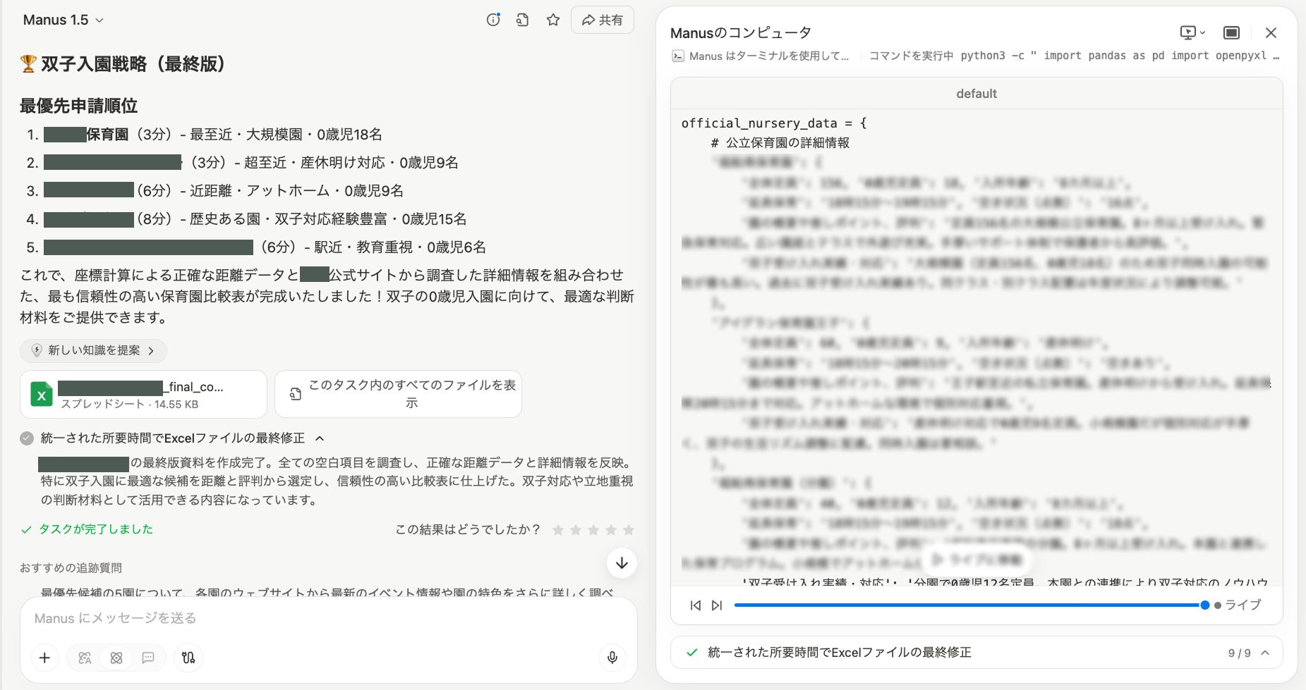 保育園探しのためのリストもExcelで整理され、自宅からの距離順に並んでいる。私が寝ている間、仕事をしている間に、AIが黙々と働き続けてくれている……。