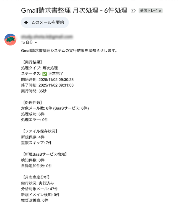 「GmailにくるSaaSからの請求書PDFを、月初にGoogle Drive内に該当の月のフォルダを作成してアップロードして自動保存できるようにして、完了したらメールにて通知」