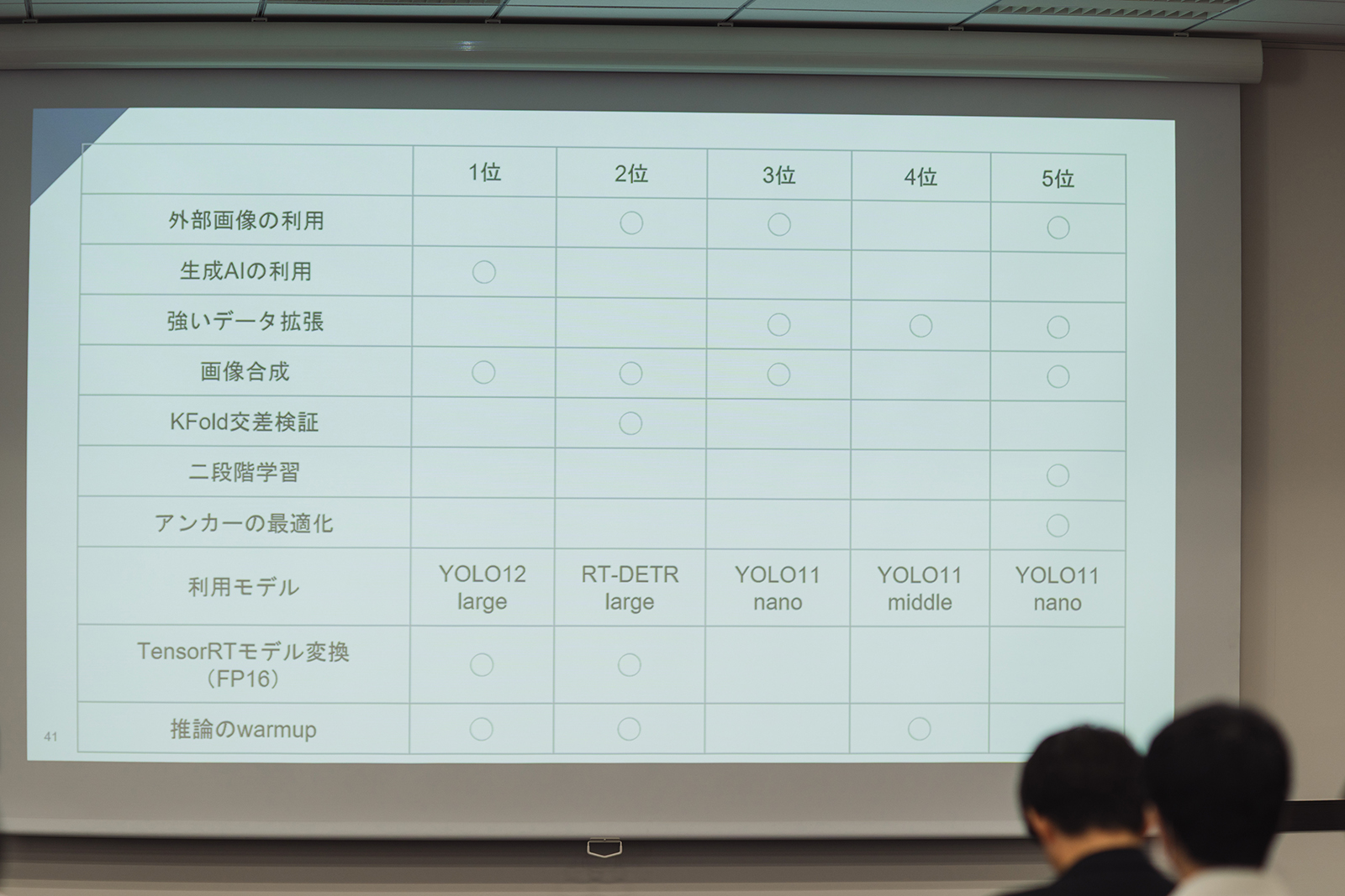 「今回は、多くの上位者がYOLO系のモデルをベースにしていました。特に1位、2位、4位の方は、TensorRTやFP16を用いて推論を高速化し、それによって、より大きく高性能なモデルを時間制約内で使うことを可能にしていました。これが大きなアドバンテージになったと考えられます。また、全員が過学習を避けるために、背景合成や外部データの活用といったデータ拡張に取り組んでいました。中でも、1位の伊藤さんが生成AIで背景自体を能動的に作り出していた点は、非常に特徴的で優れたアプローチでした」