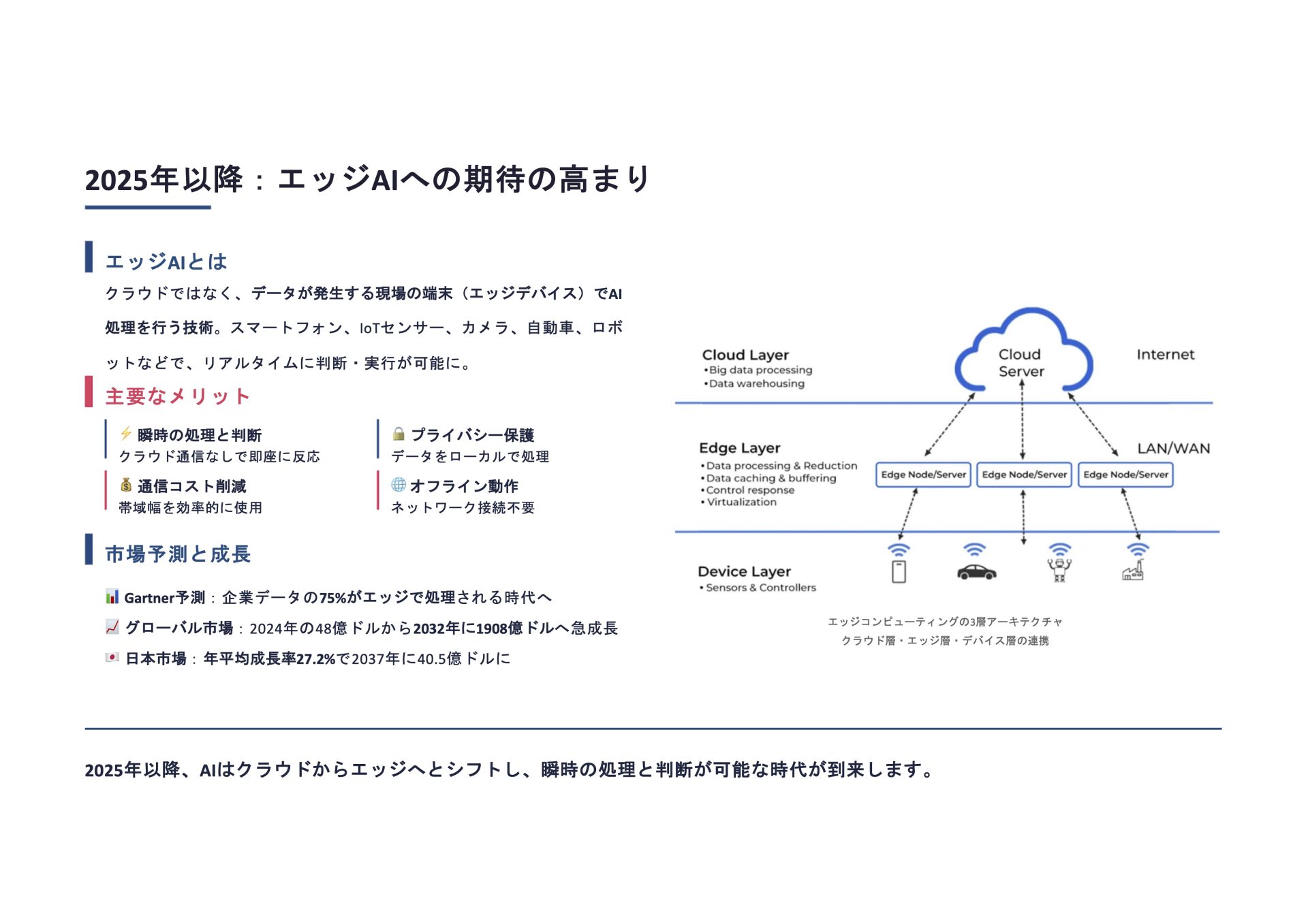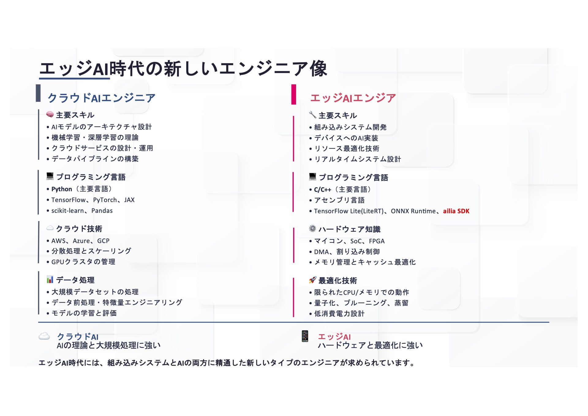 「つまり、クラウドAIエンジニアとエッジAIエンジニアでは、求められるスキルセットが大きく異なるのです。『AIの理論』だけでなく、『ハードウェアの制約』を深く理解し、メモリや帯域の限界の中で性能を絞り出す。そんな職人芸的な最適化技術を持つエンジニアが、これからのエッジAI開発には必要なのです」